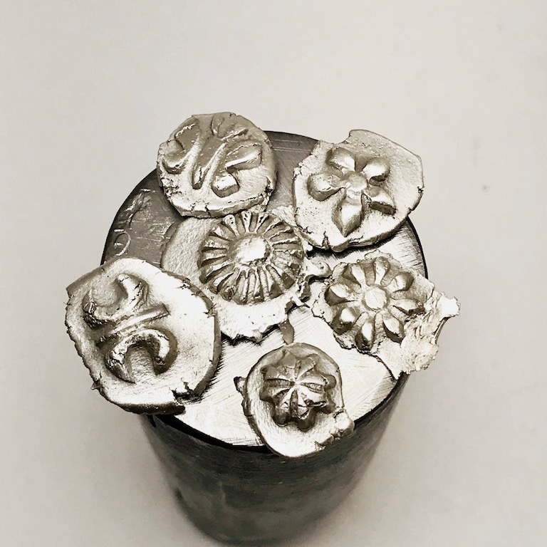 Just melt a silver, copper, nickel, or brass metal into a ball, but make sure you oil your bead design to make it easier to get the design out. Then place the ball into the design you chose and hit with a hammer until the ball is flat, Remove the ball with a plier or sharp object and the design will pop out.